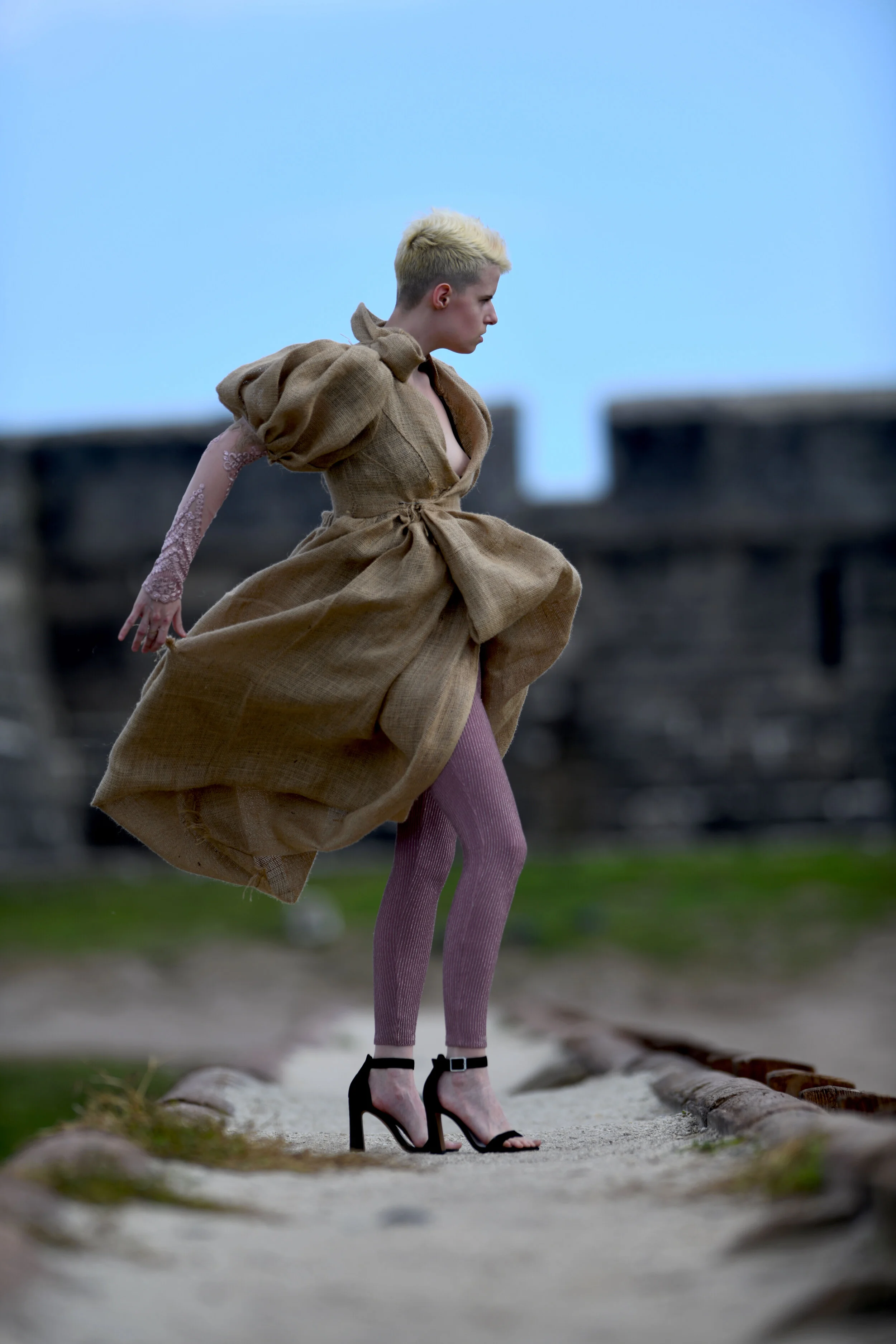 This mainly points to several examples where I’ve chosen to create gowns out of supplies not traditionally meant for apparel. I know a lot of creatives will think way outside the proverbial box in times of frustration, and this has been one angle that has proven positive for me. So, for example, for an event, I once constructed a wedding gown out of a clear plastic tarp and aluminum foil. She did receive a proposal from a stranger on Clark St. in Chicago. Apparently, my design was believable.