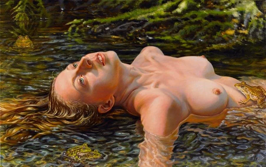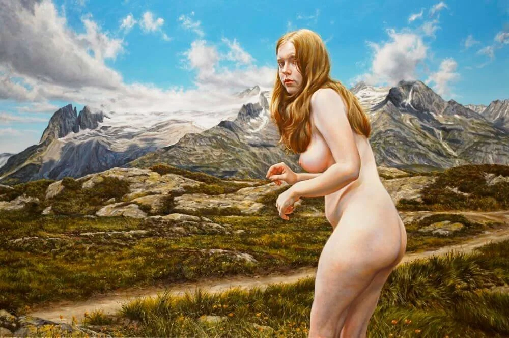 At first, my nudes in landscape were very pure. There was no indication of time. I began to bring in contemporary objects of consumption to bring the paintings clearly into the now. I also wanted to emphasize the discrepancy between the world which nature has provided us with and the world which we have created for ourselves. We often choose bright and shiny over organic, plastic over biological, artifice over nature and I'm exploring on some level why that is. We covet and surround ourselves with inanimate and artificial distractions, and turn increasingly away from our fellow beings and I wonder what´s behind that. I am juxtaposing these two worlds in a deliberately stark way in order to provoke my viewer to think about it with me.