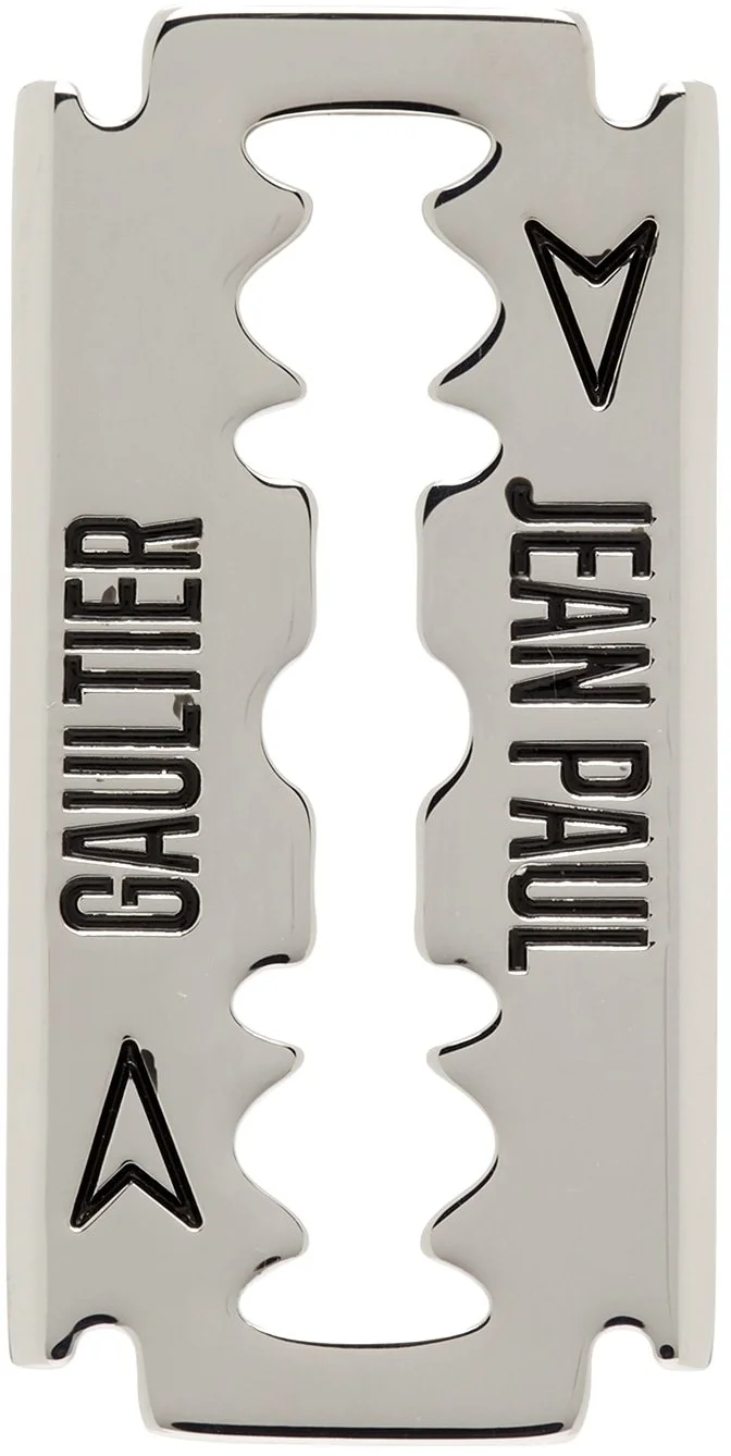 Presented in the Logo-ltier ready-to-wear selection, the Gaultier label is boldly printed in an all-over pattern. Like a traditional handmade stamp transformed into a unique motif, it covers jeans, leggings, as well as mesh tops. Sports jerseys embroidered with "Jean Paul" logos pair up with "Gaultier" signed safety pins. Last but not least, silver or rhinestone razor blades embellish ears, curl around fingers and are clipped into the hair.