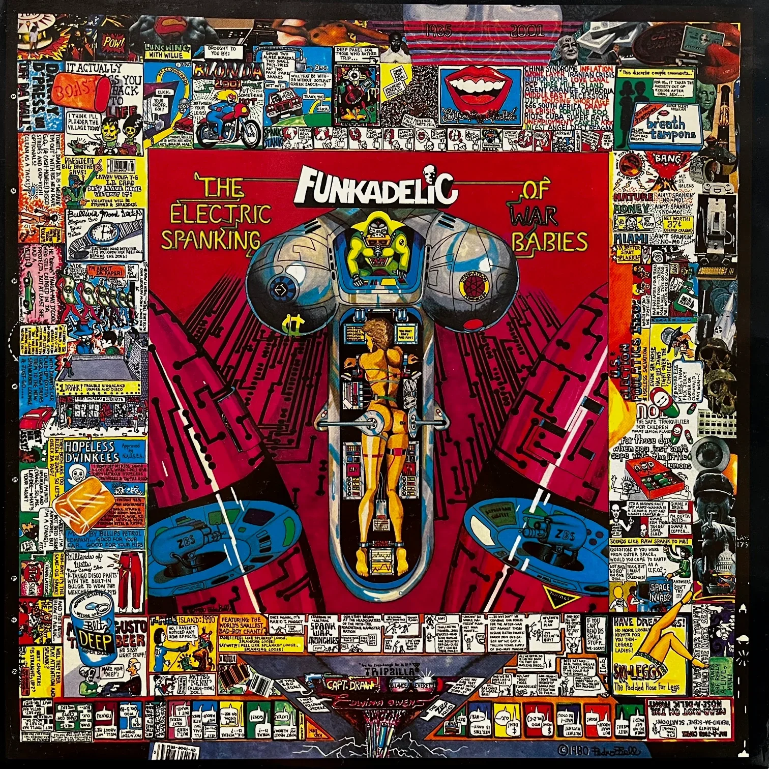 This album was my favorite Funkadelic album, and (in my opinion) the best work Pedro ever did. He utilized practically every inch of the album with his artwork, “scartoons”, and prose. He was forced to censor the cover by Warner Bros., who had him create a second cover to go over the one above.